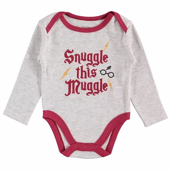 - Bodysuit: lapped shoulders, long sleeves, inseam snaps, “Snuggle This Muggle” caption