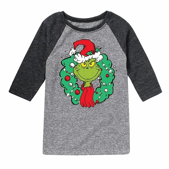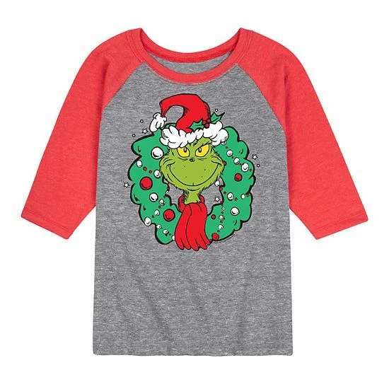 His heart will grow three sizes when he wears this Boys 8-20 Dr. Seuss How the Grinch Stole Christmas Wreath Raglan Graphic Tee.
