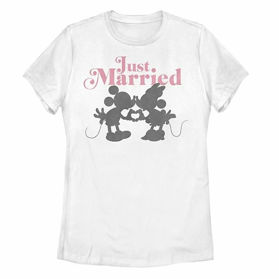 Celebrate your big news in this charming juniors’ Mickey and Minnie Mouse “Just Married” graphic tee.