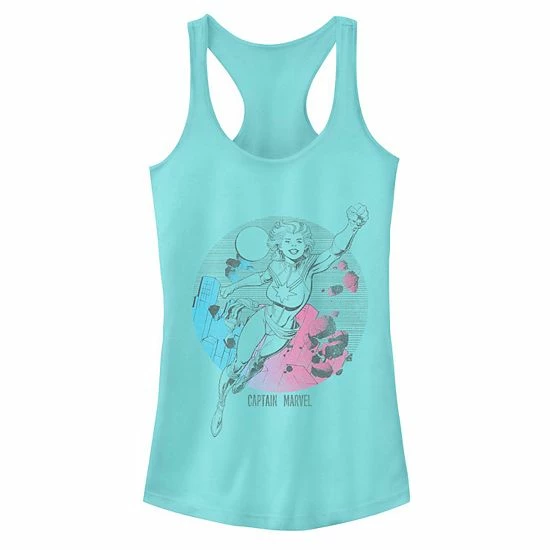 Step up your your superhero style in this juniors’ Captain Marvel comic skyline portrait tank.