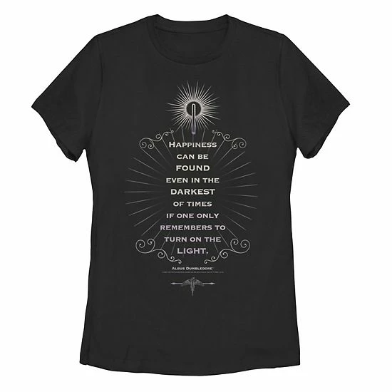 This juniors’ Harry Potter short sleeve tee features an enchanting reminder that even in the darkest of times, happiness can be found if one only remembers to turn on the light. In black.