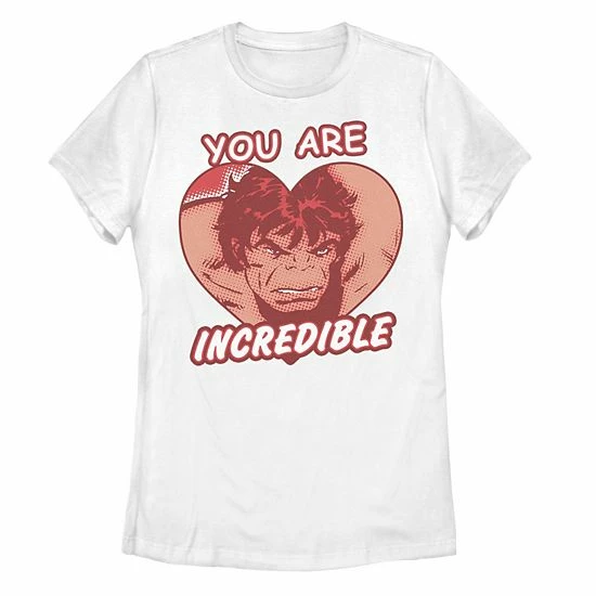 Let Marvel’s Incredible Hulk spread your Valentine’s Day message when you sport this colorful juniors’ graphic tee.