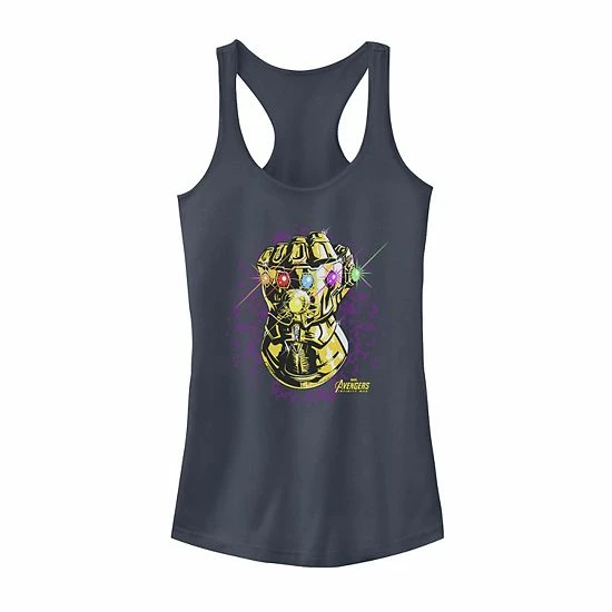 Become the envy of the universe when you wear this juniors Marvel Infinity Gauntlet Comic Style Portrait tank.