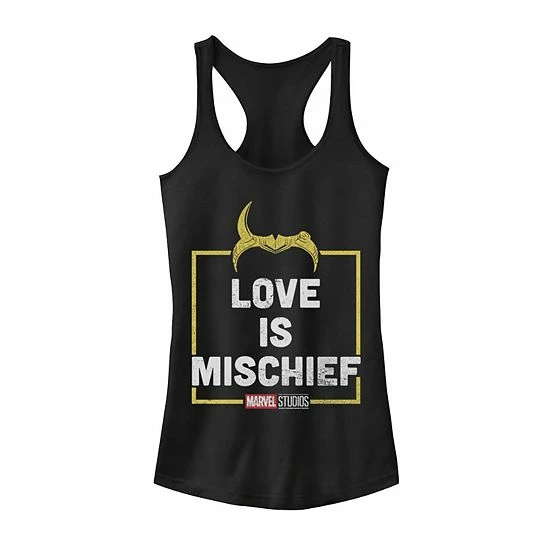 Express yourself with this Juniors’ Marvel Loki Love Is Mischief Tank.