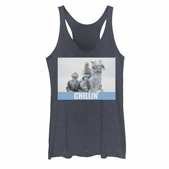 Chill out in style on the ice planet Hoth with Han Solo, Luke Skywalker and a tauntaun in this juniors’ Star Wars racerback tank top.
