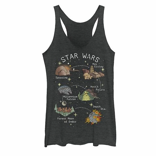 Chart a course through the planets of the Star Wars Universe in this juniors’ pop art-style tank top.