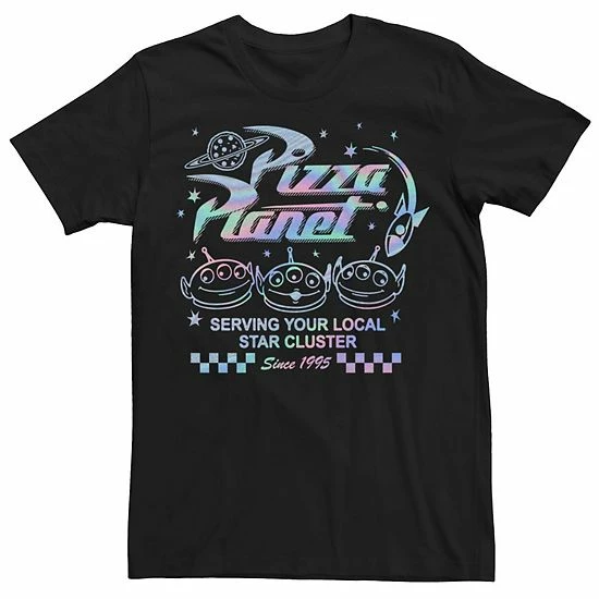 Toy Story is a childhood staple, so this fun men’s ©Disney / Pixar Toy Story Four Pizza Planet Holographic Serving Your Local Star Cluster Tee needs to be a staple in your wardrobe.