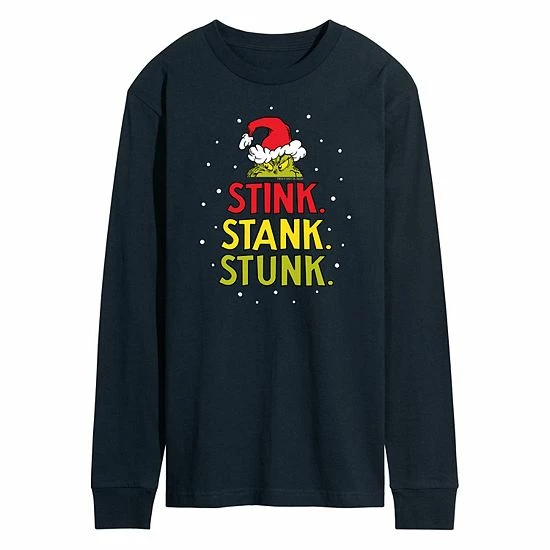 Your holiday wont stink when you wear this Dr. Seuss The Grinch stink, stank, stunk long sleeve graphic tee.