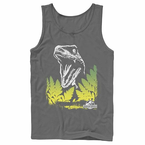 He’ll love the look of this Men’s Jurassic World Raptor Roaring Behind Bushes Graphic Tank Top.